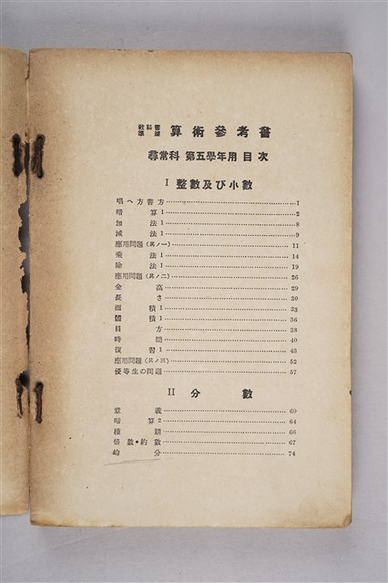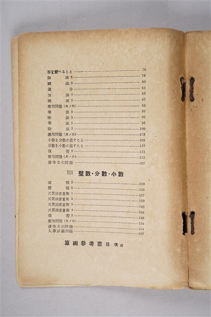 該物件為1931年(昭和6年)田中宋榮堂再版發行的算術參考書(初版日期不詳),供尋常小學第五學期的學生使用,作者為數學研究會。內容包含整數、小數、分數的運算及應用,每章節均載明參照的教科書頁數,並羅列數個練習題及詳解,便於學生自習。該書封面寫有「柯枝生」三字。