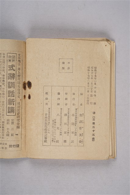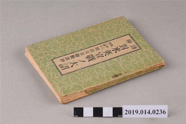 該物件為1942年(昭和17年)2月11日八光會發行的小書《謹解 對米英宣戰ノ大詔》(初版日期為1942年1月30日),編者為聖訓普及會。該書收錄1941年(昭和16年)日本對美英二國宣戰之詔書與政府聲明、1894年對中國宣戰詔書,以及戰時に拜し奉る明治天皇御製謹抄,旨在凝聚全國人民,為國奉獻。該書內容反映出日本的對外態度,以及對大東亞戰爭的定位。