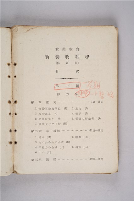 該物件為京極書店出版的實業教育新制物理學教科書,作者為理學士桑田敬治,原物主為柯瑞吉。全書共六編:靜力學、熱學、運動與加速度、音、光學、電力磁力學。
