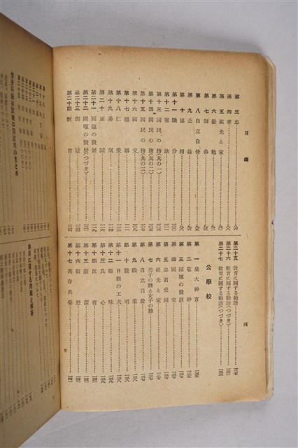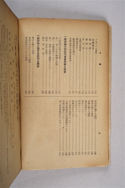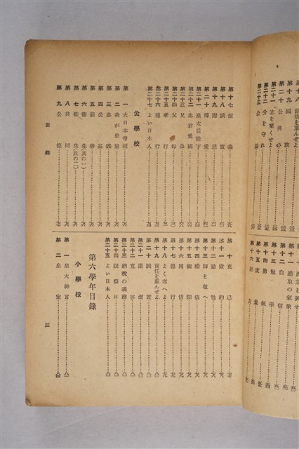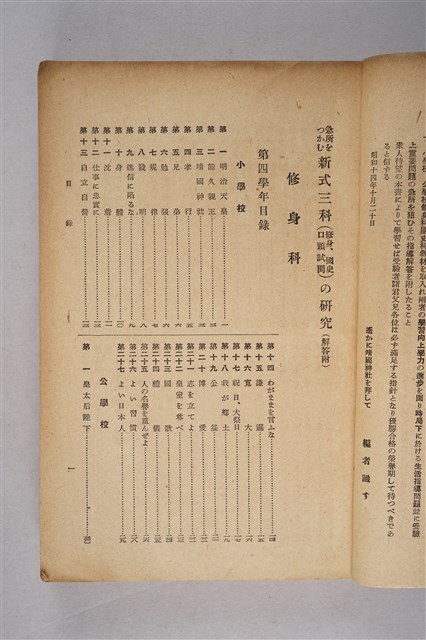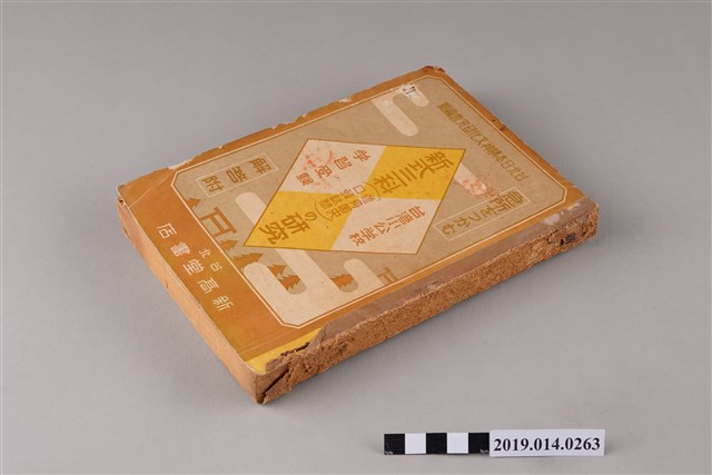 該物件為1940年(昭和15年)12月11日臺北新高堂書店再版的參考書《參考書-新式三科(修身國史口頭試問)の研究》(初版日期為1939年10月25日),由臺北日本精神文化研究會編纂,供臺灣小公學校學生應試用。修身科內容依照學校類別、學年(第四至六學年)進行分類,口頭試問依問題種類羅列各式問題與參考答案,而國史科僅照學年(第五至六學年)來分。美不封底印有「河村藏書」之紅印。