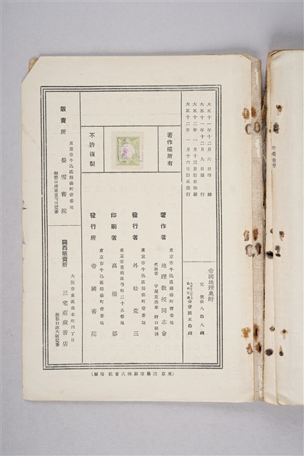 該物件為1923年(大正12年)1月16日東京帝國書局訂正再版的地理書籍《地國地理奧附》(初版日期為1922年12月9日),作者為地理教授同志會。全書分二編:第一編為地方誌,介紹日本帝國各地(包含臺灣與朝鮮)區域特性、地勢、氣候、產業、交通、人口與城市;第二編為總括,分為自然地理與人文地理。