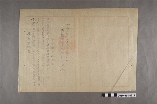該物件為1946年8月28日新化鎮第一學民學校校長王教本開予柯天送之服務證明書,其上紀錄柯天送於1922年4月10日至1932年3月31日在新化公學校任教,1944年3月31日至1945年10月30日在新化北國民學校任教。推測新化公學校與新化北國民學校為戰後新化鎮第一國民學校之前身。該服務證明書與中等學校教員申請無試驗檢定履歷表為申請無試驗檢定之必要文件。