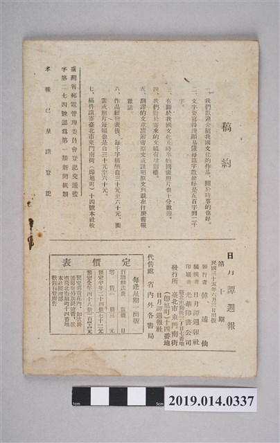 該物件為1946年(民國35年)6月3日由日月譚週報社所發行的第十期週刊。內容包含時事評論、政策與政府介紹、中國地理歷史、國語(中文)教學等,旨在讓民眾透過淺白字句了解新政府與國家。書封寫有「民三五.七.一七購入」之字樣,並印著「新化農業實踐女學校」之藍印。