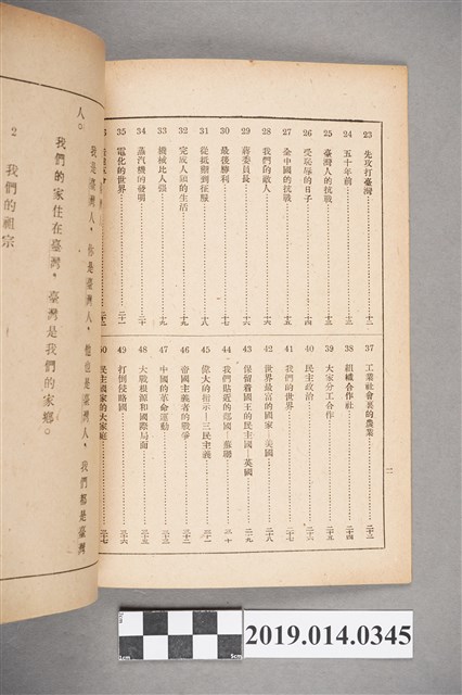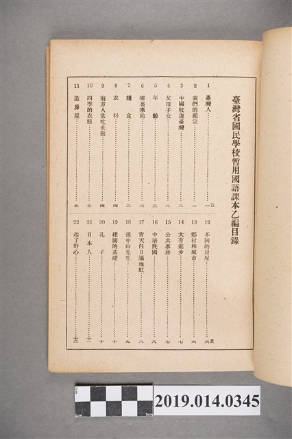 該物件為臺灣省行政長官公署教育處於1946年(民國35年)3月所編印的國民學校暫用國語課本。全書共五十課,內容除中性的知識傳遞,尚包含帶有強烈中華民國國族意識的短文。