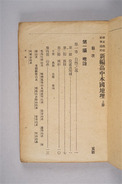 該物件為中華書局印行之高中地理教科書,由葛綏成編。全書共二編:第一編「概論」介紹中國之自然與人文景物,以及地理相知識;第二編「區域分論 上」分區介紹中國各地的自然與人文地理情況。自第130頁後缺頁,故無法確知準確的出版日期。