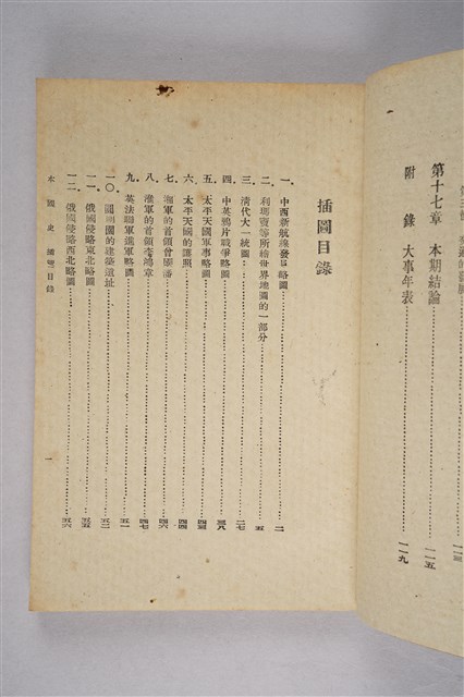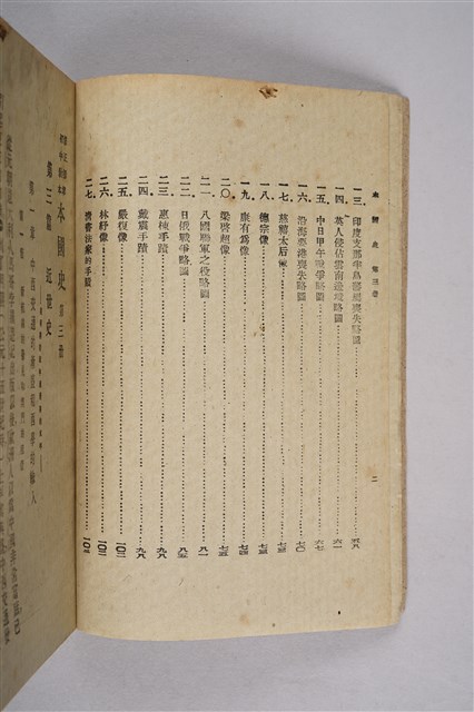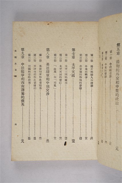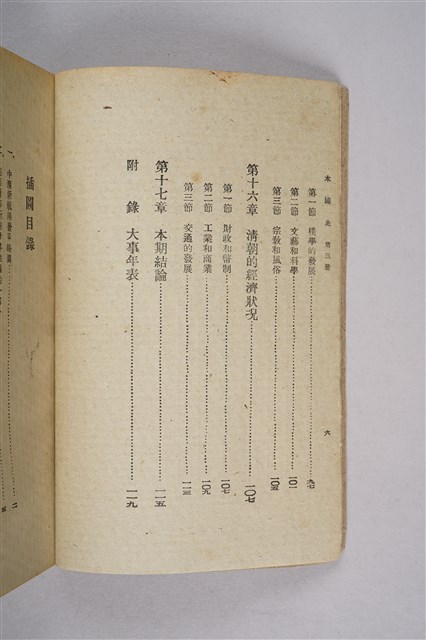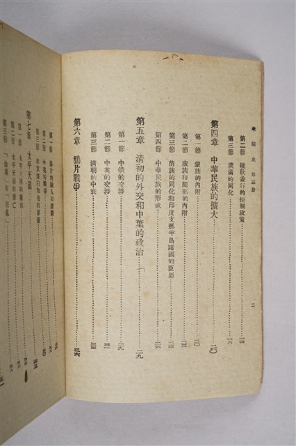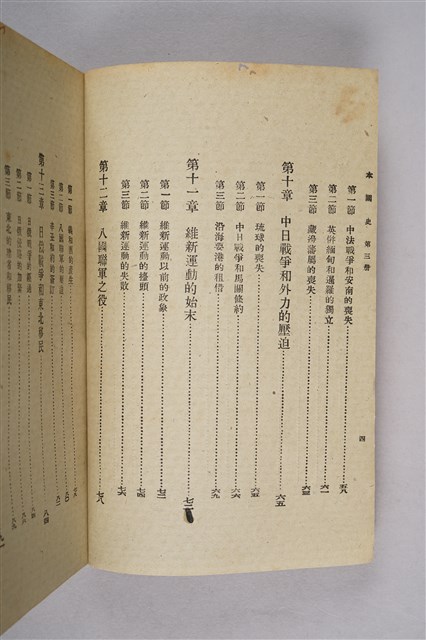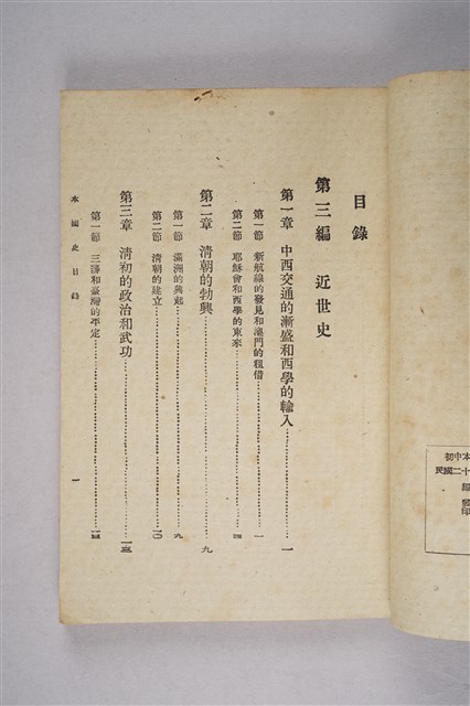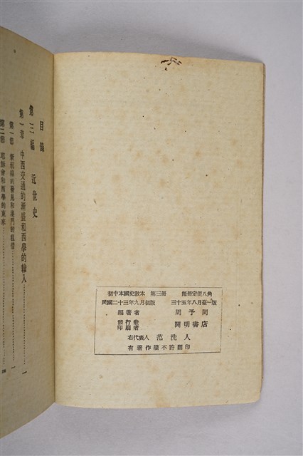 該物件為1946年(民國35年)8月開明書店再版的初中中國史教科書(初版日期為1934年9月),作者為周予同。該書為整套歷史教材的第三編,內容為近世史,始自十六世紀西方傳教士東來至清末,共分十七章。每一章均列問題數個,供學生練習。書封印有臺南縣立新化初級中學之紅印。