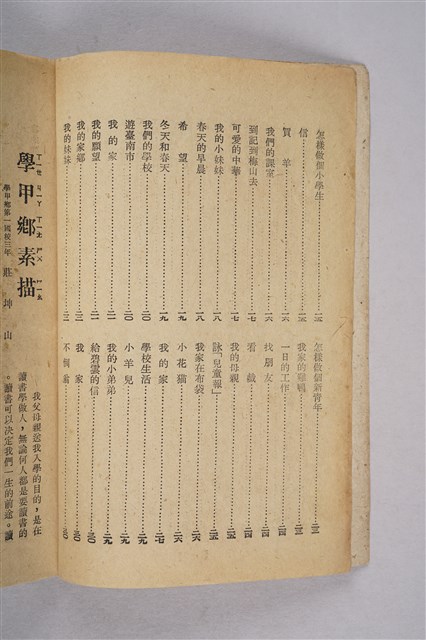 該物件為1947年臺南縣兒童週報社編、臺南縣文化出版社發行的兒童叢書《兒童園地》第壹輯。內容為國校學生的投稿作品,題材廣泛,包含家鄉、校園、國族主義等,由此可見當時的教育方向。