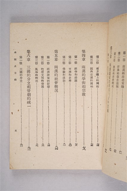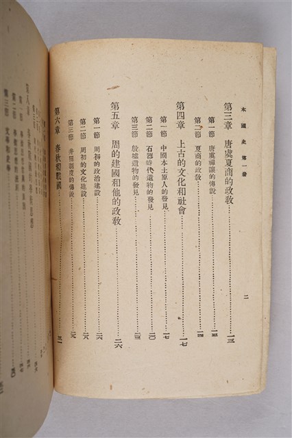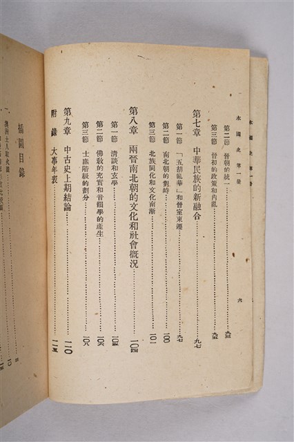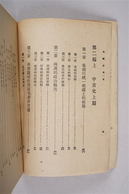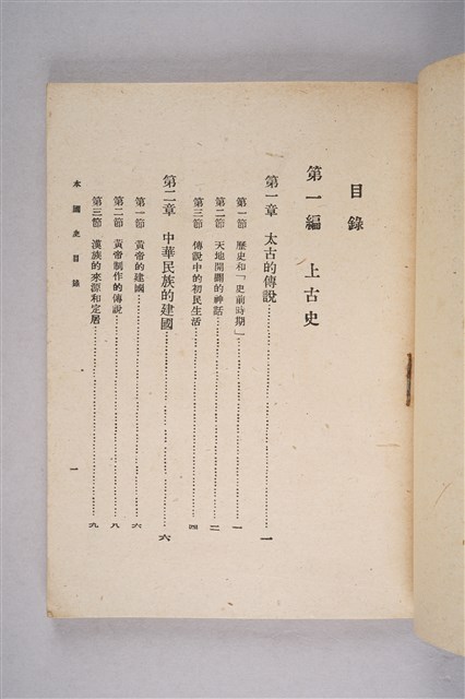該物件為開明書店出版的初級中學本國史教科書第一冊,作者為周予同。全書共兩編:上古史、中古史,各有九章。前者包含中國神話、中華民族,以及始自石器時代至春秋戰國時期的歷史變遷,試圖透過歷史建構國族的合理性。後者則談論秦朝至魏晉南北朝的政治與社會。書封印有臺南縣立新化初級中學之紅印。