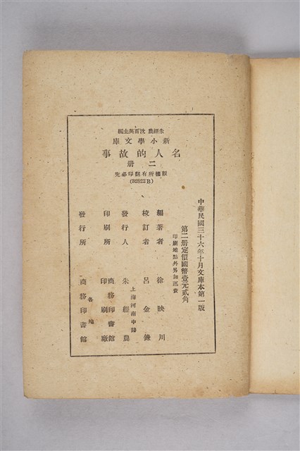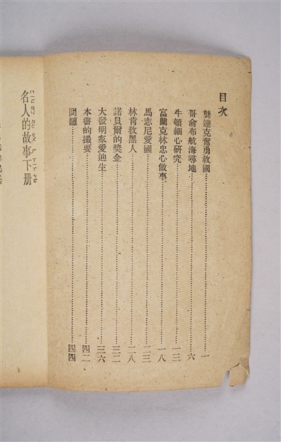 該物件為商務印書館於1947年(民國36年)10月發行的新小學文庫第一集《名人的故事》第二冊,編著者為徐映川。書中共收錄八個他國歷史人物的故事,書末附問題三十則,供學生思考、練習。內文均有注音標示,文句淺顯易懂,供小學五年級生使用。