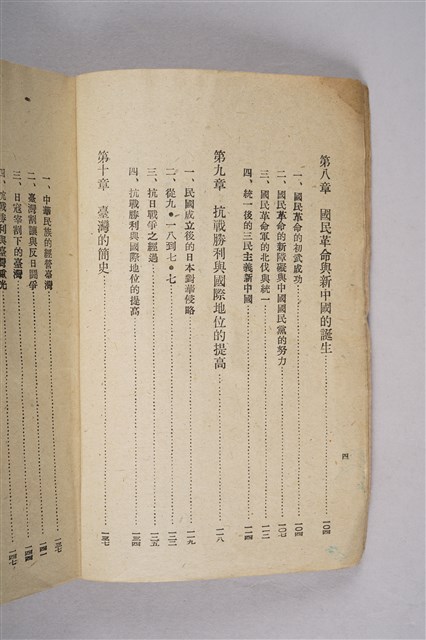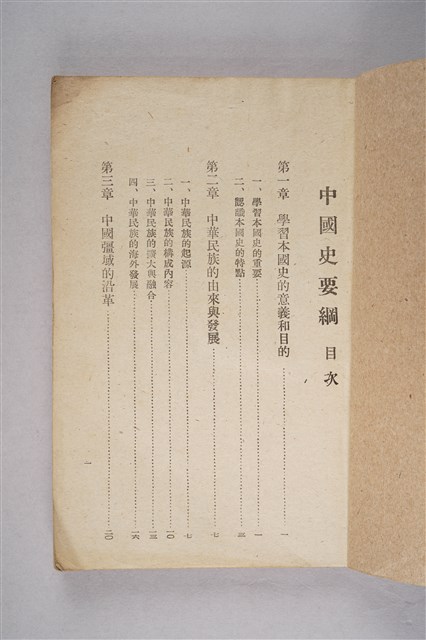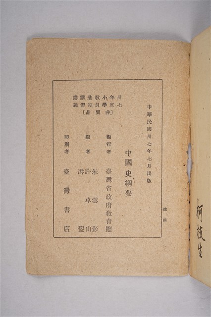 該物件為1948年(民國37年)臺灣省政府教育廳編印的小學教員暑期講習講義之三《中國史綱要》。原物主為柯枝生。全書共十章,內容包含中華民族的起源、中國歷朝簡史、近代西方的侵略與中國的改革運動、革命與抗戰、臺灣簡史等。其中在臺灣簡史中,日本被塑造成「宰割」臺灣的惡人,而中華民國是拯救臺灣英雄。
