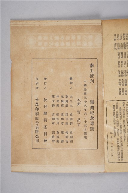 該物件為1949年(民國38年)6月15日臺灣省臺南工業職業學校校刊編輯委員會發行的畢業紀念專號校刊。內容包含學生投稿、現任教職員與畢業校友名錄、校長與師生照片等。