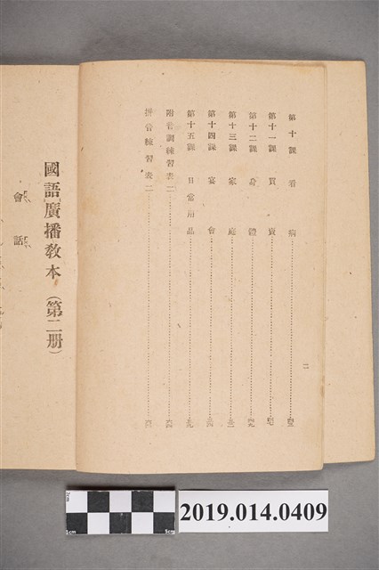 該物件為1946年(民國35年)2月28日臺灣實業股份有限公司出版部發行的《國語廣播教本》第二冊,編著者為林忠。該書共十五課,以日常生活題材為內容,旨在教導臺灣人中文會話。