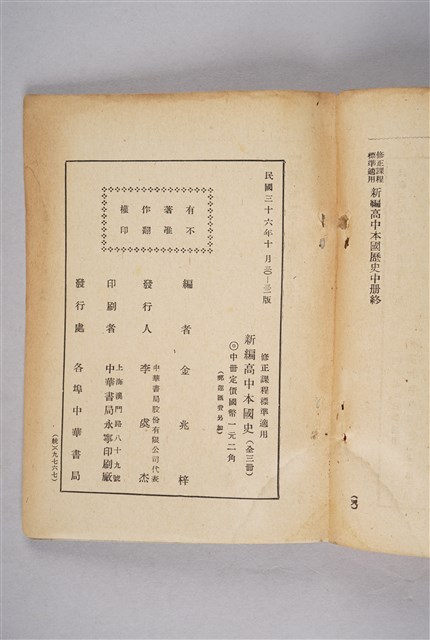 該物件為1947年(民國36年)10月30日中華書局再版印行的新編高中本國史中冊,由金兆梓編著。該書共四章,自隋唐談到明末的政治與社會。