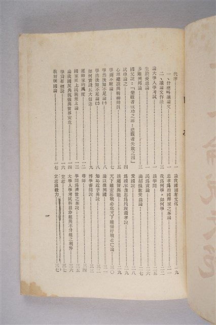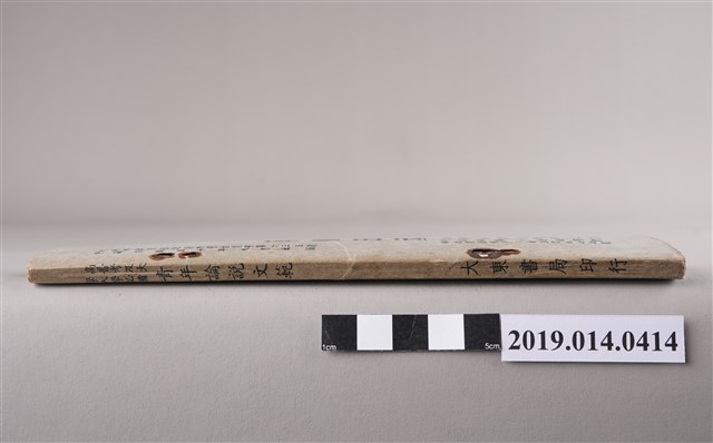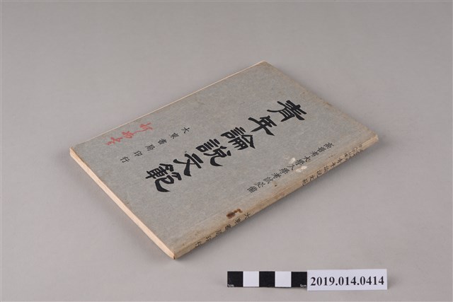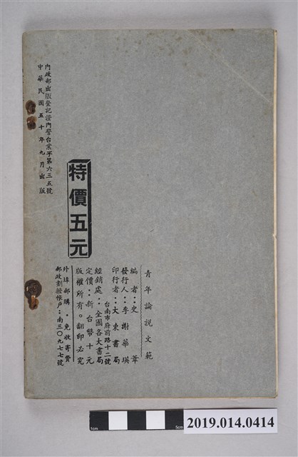 該物件為1961年(民國50年)9月大東書局印行的高普考、大學入學考試參考書《青年論說文範》,編者為史葦。該書首先說明議論文的定義與寫作方法,後列舉多篇例文。例文主題多與愛國與德行有關。封面印有「柯瑞吉」之紅印。書內夾有已破損一半的手稿,內容為清朝文人蔣衡的〈鞭虎救弟記〉。