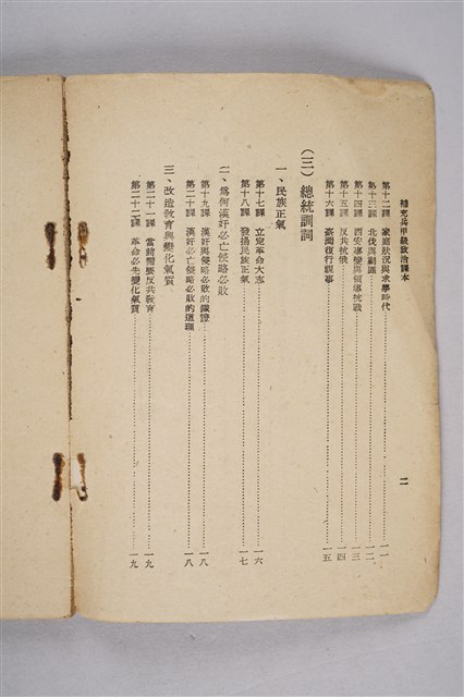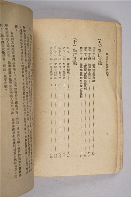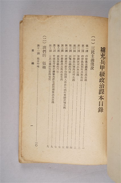 該物件為1954年(民國43年)10月由陸軍總司令部編印的《補充兵特種兵甲級政治課本》。全書分十個部分:三民主義淺說、我們的領袖、總統訓詞、中華歷史、中華地理、臺灣鄉土、俄帝侵華史、共匪暴行、軍法常識、保防常識,試圖透過此些內容傳遞特定政治思想。