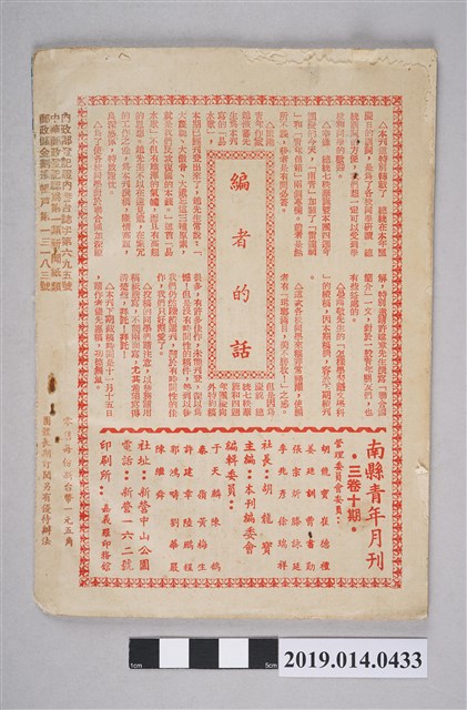 該物件為1956年10月31日中國青年反共救國團臺南縣支隊發行的刊物《南縣青年》第三卷第十期,內容包含總統告全國軍民同胞書、新知介紹、詩詞、短文等,主題多圍繞在效忠領袖、愛國、反共復國等與當時國家政策密切相關的議題上。