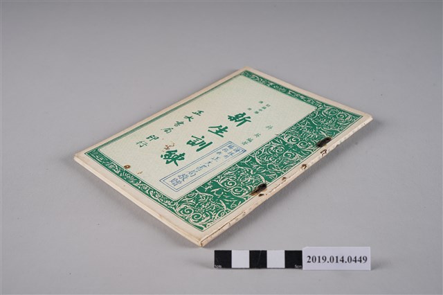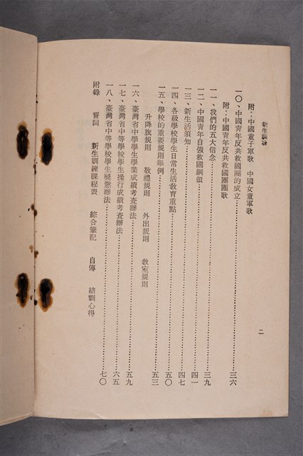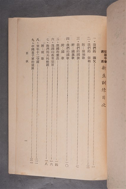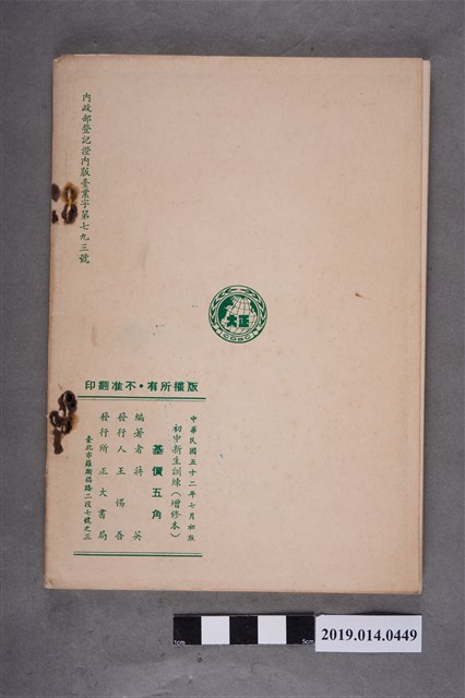 該物件為1963年(民國52年)7月正大書局發行的《初級中學適用 新生訓練》,編著者為蔣英。全書共十八課,內容包含國父、國旗、國歌、憲法、青年十二守則、新生活須知、中國青年自強救國綱領、臺灣省中學學生學業成績與操性成績考查辦法、獎懲辦法等。書末附有誓詞、新生訓練課程表、綜合筆記、自傳與結訓心得等空白表格。