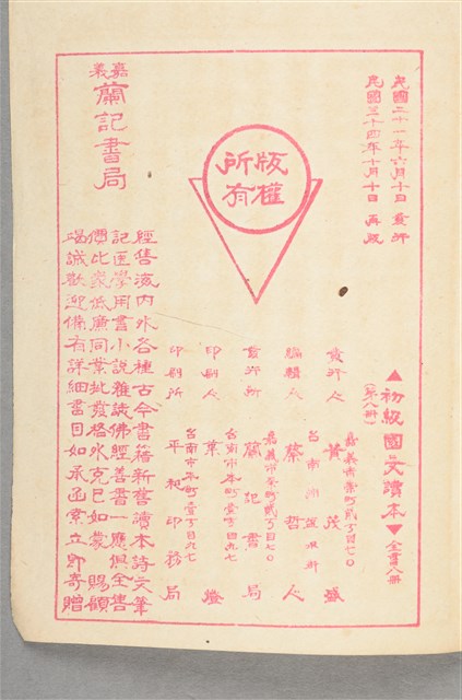 該物件為1945年10月10日蘭記書局再版的繪圖初級國文讀本第八冊(初版日期為1932年6月10日),編輯人為蔡哲人。該國文讀本共八冊,每冊均有五十課,內容以文言文寫成。