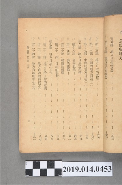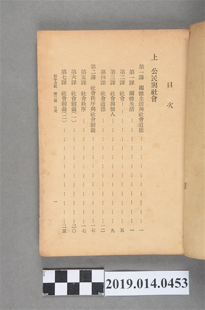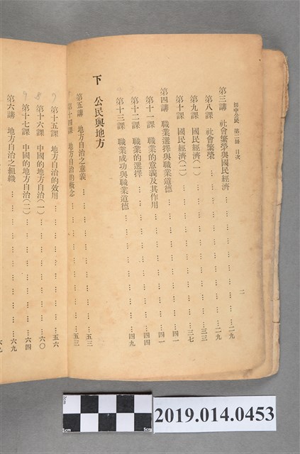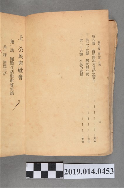該物件為1950年(民國39年)7月由正中書局再版的初級中學公民課本第三冊,編著者為林紀東。全書分上下兩編,共八講。上編介紹團體生活、社會秩序、國民經濟與職業道德,下編則地方自治。書封以紙包覆。