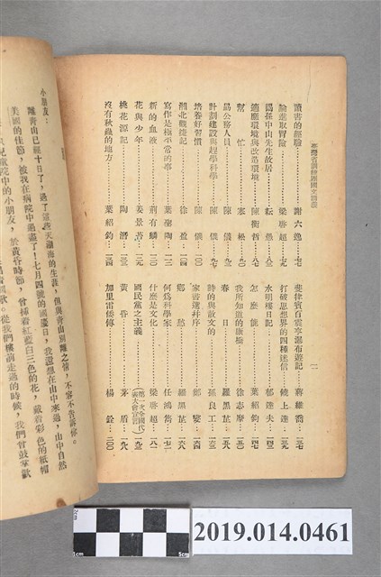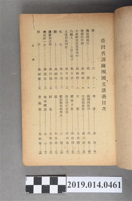 該物件為1946年(民國35年)10月臺灣省訓練團印型的訓練教材之四國文。該書共選五十篇文章作為國文學習教材,文章多為白話文,其中不乏當時著名人士朱自清、梁啟超、冰心、徐志摩等人的作品。另外,亦有陶潛、施耐庵的作品。 臺灣省訓練團的前身為1945年10月由臺灣省行政長官公署成立的「臺灣省地方行政幹部訓練團」。1946年8月更名為「臺灣省訓練團」,運作至1949年2月。唯1956年7月臺灣省政府又恢復訓練團,1994年更明為「臺灣省政府訓練團」,1997年改制為「臺灣省政府公務人力培訓處」。1999年改由行政院人事行政局統轄,並更名為「行政院人事行政局地方行政研習中心」。2012年,再次更明為「行政院人事行政總處地方行政研習中心」。2017年與行政院人事行政總處地方行政研習中心合併為「行政院人事行政總處公務人力發展學院」。
