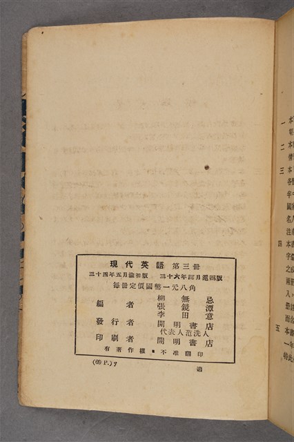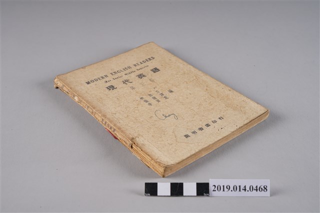 該物件為1947年 (民國36年)3月在開明書店再版的《現代英語》第三冊(初版日期為1945年5月),編者為柳無忌、張鏡潭、李田意。根據該書編輯大意,《現代英語》共六冊,每冊課文二十篇,可作高級中學教材。該書第96至131頁,羅列英文字彙、片語的中文釋義。書末寫有「省立岡山中學高中二蔡士明」。