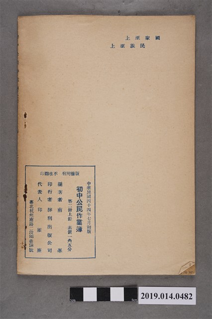 該物件為1955年(民國44年)7月勝利出版公司出版的初中公民作業簿第二冊上冊。根據其編輯大意,該作業簿是「配合臺灣省教育廳發行的《標準教科書初中公民》而編」,共三冊,編者為南峯。全書共十二章,內容涉及家庭生活、學校生活、社會生活等。每一章分成兩部分:第一部分為「內容提要」,將條列該章重點;第二部分「練習」提供各式題目,協助學生複習。封面印有「勝利出版公司敬贈」之藍印。