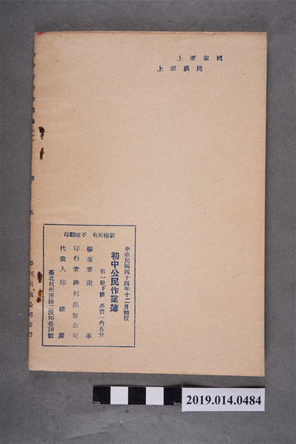 該物件為1955年(民國44年)12月勝利出版公司出版的初中公民作業簿第一冊下冊。根據其編輯大意,該作業簿是「配合臺灣省教育廳發行的《標準教科書初中公民》而編」,共三冊,編者為南峯。全書共十二章,內容涉及民族道德、青年守則、禮義廉恥等道德規範。每一章分成兩部分:第一部分為「內容提要」,將條列該章重點;第二部分「練習」提供各式題目,協助學生複習。封面印有「勝利出版公司敬贈」之藍印。