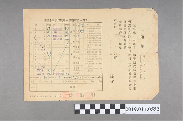 該物件為臺灣省立臺南工業職業學校於1950年(民國39年)2月寄給捐贈者柯瑞吉之父柯天送的成績通知單,其上載有柯瑞吉在第三十八年度第一學期的各科成績、操行成績、體育成績、平均成績、名次、出席狀況,並印有校長、教務主任、訓導主任及級任導師的印章。從名次來看,柯瑞吉的成績較前一學期進步非常多(全班共14名學生,排名4)。