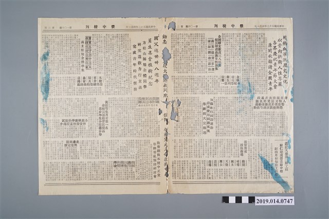該物件為「臺南縣立新豐中學校刊 第104期」,發行日期為1963年(民國52年)4月1日。該校刊共4版,內容包含總統訓詞:第二十屆青年節告全國青年書、有關學校之報導、受獎學生報導、學校措施等。