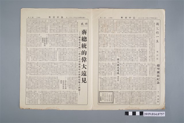 該物件為1958年11月20日中國青年反共救國團長榮大隊長中青年社發行的《長中青年》第28期(推測應文29期,但刊物上印著第28期)。該刊物共4版,內容多以國父誕辰紀念日為主題,另轉載〈蔣總統的偉大遠見──「蘇俄在中國」一書中之預測與現在國際局勢之演變」〉。