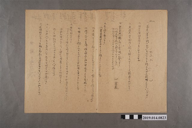 該物件為河村禧元生物科答案卷,河村禧元為捐贈者柯瑞吉的日本姓名。該答案卷詳列47題生物科試卷作答內容,但目前尚未找到相對應的題目卷。答案卷背面印有試題,編號100,測驗科目為國民科,內容包含防空演習、皇室典範、豐臣秀吉、德川幕府、條約改正等,但其上無做答痕跡,僅有一些計算過程和「腎臟」二字。