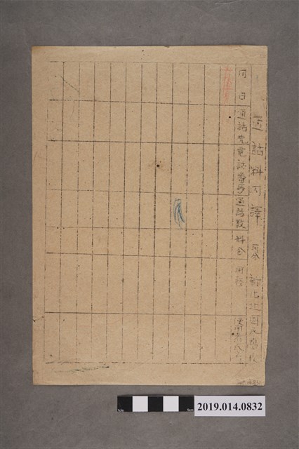 該物件為新化北國民學校的通話費單句(日文寫作「通話料內譯」),表格上無任何記錄,僅有紅筆和藍筆的畫記。背面有筆記和算術科答案,從字跡推測應為捐贈者柯瑞吉所寫(其日本姓名為河村禧元)。
