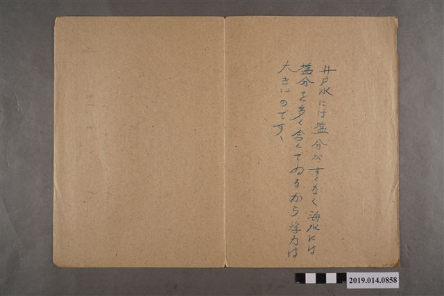 該物件為河村禧元的試卷,上有編號73。內容包含敬神的方式、明治維新後的國體變化、德川吉宗、松平定信、陸奧宗光、小村壽太郎、水得沸點與冰點、腳踏車的原理、重力的方向、雞蛋在鹽水中浮起的原理等。就內容推測該試卷為學立綜合測驗,測驗科目有理科、國民科、國史科。試卷上有紅筆批改痕跡,但無分數。背面寫著:「井戶水には塩分がすくなく海水には塩分を多く含んでのるから浮力は大きのです」