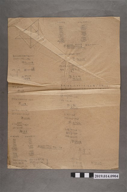 該物件為算術科作答紙,紙張正反面均寫了算式,並畫了幾個圖形。就筆跡和內容推測,該物件應為捐贈者柯瑞吉用來練習的紙張。