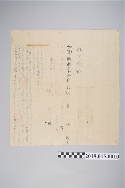 本件屬於岸裡社潘家文書其中一件,此件為道光16年(1836)西勢尾社阿四老馬下六繼承祖地水田一份,坐落在土社口庄背,每年納租谷20石。今因缺錢應用,向林崑瑺兄弟調借現金280大元,並議定將此水田典讓抵押給林崑瑺兄弟耕作10年,從道光17年(1837)到道光26年(1846)止,田主所借出典錢銀的利息以每年所需繳納的租谷20石抵銷。10年期限屆滿後,田主如返還所借銀項280大元即可贖回水田,之後林崑瑺兄弟仍可承耕此田。註光緒10年(1884)田主加借佛銀2元。另註此件於明治36年(1903)田主無力返還所借銀項贖回水田,已找盡賣斷給林崑瑺兄弟。此件與108030-0011〈道光16年10月西勢尾社番阿四老馬下六付耕典田收銀字〉為同1組。 此件背後無托裱,契面完整無破損,所有文字皆可清楚辨識解讀。此件共蓋有「理番分府給葫蘆墩社副通事潘明賢長行記」、「崎仔新社甲首潘阿沐四老紀」等2人,共5印,印內容透露的訊息,值得進一步研究解讀。此承耕典田偹銀字可了解中部平原番漢土地典現的情形,並可進一步探討當時番漢土地典現的合理性,具有珍稀性。