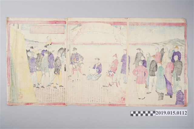 情境,共1張影幅。 日本明治初期出版一種視覺新聞媒體,其中一篇報紙文章用一張浮世繪描繪,此類報紙夾頁宣傳海報多為單幅,本圖為當時盛行的三連錦繪圖,凸顯出此新聞在當時內容應受到極度關注。相較於純文字的新聞報導圖像能更吸引人,也更能普及大眾以增加報紙銷售量。 此幅繪者一蕙齋芳幾,本名落合芳幾(Ochiai Yoshiiku , 1833- 1904)為從幕末到明治時期非常活躍的浮世繪繪師之一。姓落合,名幾次郎。畫姓為歌川。話號有一恵斎、一蕙斎、蕙斎、朝霞楼、洒落斎、蕙阿弥等等。 此系列浮世繪畫報製作年代在1893-1895年之間,詮釋當時日本如何記錄19世紀末的這場大戰,及對戰爭的宣傳情況。當時絕大多數的繪圖製作者並未親歷現場,所描繪的圖像內容也多為虛構,並不一定符合事實。,為對一般民眾的宣傳文宣,達到與中國相互間的政治宣傳與心理戰。浮世繪圖在日本早期絕大多數為木版畫(多彩),少數為石版畫(單彩),是日本江戶時代盛行的民間藝術,既是裝飾物,又傳遞故事和信息。此種繪圖的製作由畫師、雕師、拓師按順序分工合作完成,從繪畫、刻板到上色,有著非常嚴密的工序,和日本人的性格相同,非常細膩與專業。此系列浮世繪畫報極具歷史意義和收藏價值。 此畫圖為木版畫(多彩),是由三張印刷圖膠黏合成,當時稱為三連錦繪圖。此件作品保存良好,三幅圖紙接圖膠合完美。此圖屬1895年乙未之役相關印刷類圖像文獻,蓋有繪者一蕙齋芳幾「芳幾」印3枚與「人形町狊足屋」圖款。此圖已典藏入中央研究院臺灣史研究所後設資料及數位影像,圖像史料具特殊性與珍稀性,極具保存收藏價值。