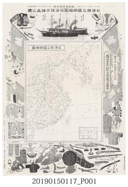 此圖為明治27年(1894))11月10日,仙臺市大町三丁目益辦堂石印印刷,宮城縣民報社佐藤琢治發行,為民報第百號附錄。此圖標題下方特別註明捕獲清朝的廣乙艦與操江艦,並將船上的戰利品詳細復印在圖繪版面四周,圖中央印製日清韓三國明細地圖。可見這張海戰大獲全勝海報,為日本當時備受宣揚自豪的豐功偉業戰績。廣乙號防護巡洋艦,為清朝自行建造的第一艘全鋼巡洋艦。本艦建成後原配屬廣東水師,甲午戰爭前夕加入北洋艦隊協助對日作戰。1894年7月25日,舊日本海軍在未事先宣戰的情況下攔截了從朝鮮返回中國的濟遠、廣乙兩艦。廣乙號奮力抗擊,終因實力相差懸殊,迅速受重創而撤退,艦上乘員自毀棄艦。廣乙號也因此成為清朝在甲午戰爭中損失的第一艘主要軍艦及全鋼軍艦。 此系列浮世繪畫報製作年代在1893-1895年之間,詮釋當時日本如何記錄19世紀末的這場大戰,及對戰爭的宣傳情況。當時絕大多數的製作者並未親歷現場,所描繪的圖像內容多為虛構,並不一定符合事實,為對一般民眾的宣傳文宣,達到與中國相互間的政治宣傳與心理戰。浮世繪圖在日本早期絕大多數為木版畫(多彩),少數為石版畫(單彩),是日本江戶時代盛行的民間藝術,既是裝飾物,又傳遞故事和信息。此種繪圖的製作由畫師、雕師、拓師按順序分工合作完成。石版印刷,起源自歐洲,日本以鉛板代替石板,製作過程較木板印刷複雜,為後世鉛版印刷的前身,其工法技巧跟浮世繪相同。但石版畫在線條的處理上較為精緻細膩,尤其在人像的臉部,藉由陰暗面詮釋,有如西洋素描畫表現,為當時繼浮世繪後之新流行風。 此圖為石版畫(單彩),保存良好,沒有任何污漬破損,雖為單彩石版畫,但具有獨特珍貴歷史性,更增加此文件收藏價值。此圖繪屬1895年乙未之役相關印刷類圖像文獻,圖像史料具特殊性與珍稀性。