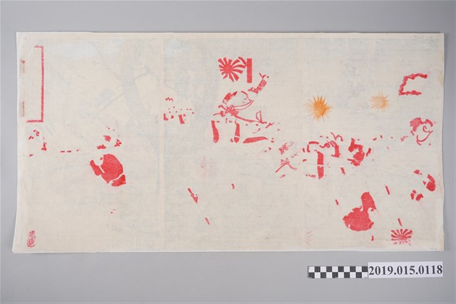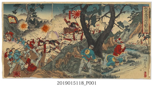 此為楊齋延一所繪畫作,由綱島龜吉於明治27年(1894)9月發行,畫面呈現山根信成少將帶領日軍進攻臺灣府,並與清軍發生衝突之意象圖,共1張影幅。山根信成 (1851-1895),為日本陸軍軍人。曾擔任步兵第12聯隊隊長、大阪鎮臺參謀、步兵第7旅團長、陸軍少將等,並於甲午戰爭後派遣至臺灣參加乙未戰爭。楊齋延一(1872-1944),別稱楊齋,明治時期的浮世繪師之一。其作品活躍於1887年至1907年,並以描繪日清戰爭、日俄戰爭等戰役浮世繪為主。 此系列浮世繪畫報製作年代在1893-1895年之間,詮釋當時日本如何記錄19世紀末的這場大戰,及對戰爭的宣傳情況。為對一般民眾的宣傳文宣,達到與中國相互間的政治宣傳與心理戰。浮世繪圖在日本早期絕大多數為木版畫(多彩),少數為石版畫(單彩),是日本江戶時代盛行的民間藝術,既是裝飾物,又傳遞故事和信息。此種繪圖的製作由畫師、雕師、拓師按順序分工合作完成,從繪畫、刻板到上色,有著非常嚴密的工序,和日本人的性格相同,非常細膩與專業。此系列浮世繪畫報極具歷史意義和收藏價值。 此畫圖為木版畫(多彩),此圖繪為三錦圖,當時中日發生戰役,在資訊不發達的時代,這一類戰事宣傳海報在當時非常暢銷。此繪畫師表現不同畫風,加入許多山川樹木,柔和戰場殺戮之氣,為此畫師獨特風格,筆觸線條也較早期其他繪圖較優,增加美感和協調性。本件背後已托裱,圖上蓋楊齋延一印「楊齋」一枚。屬1895年乙未之役相關印刷類圖像文獻,已典藏入中央研究院臺灣史研究所後設資料及數位影像,圖像史料具特殊性與珍稀性。