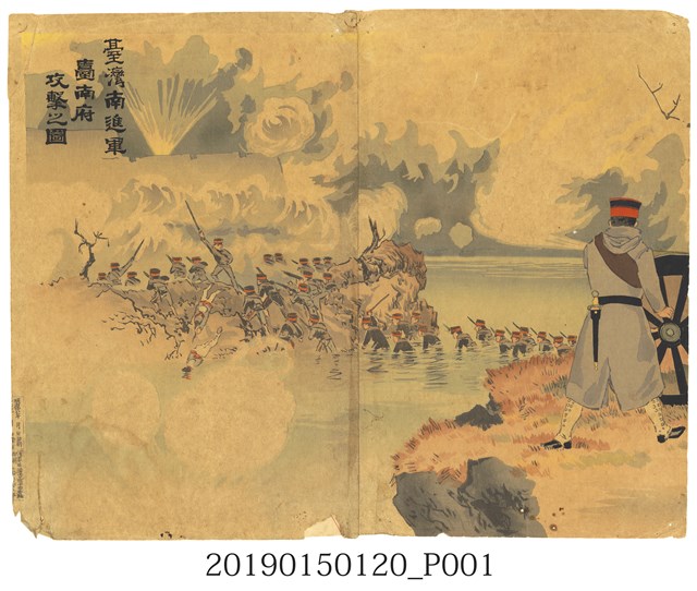 此圖出版于明治28年(1895),繪圖明確呈現出日軍以水路進攻臺南府之意象。圖畫中只見遠方砲火轟隆、煙霧瀰漫,並未呈現出兩軍交戰的場景,跟歷史記載劉永福據傳早就逃之夭夭有相符之處。此戰役在乙未戰爭隸屬最後一役,具有其歷史意義。