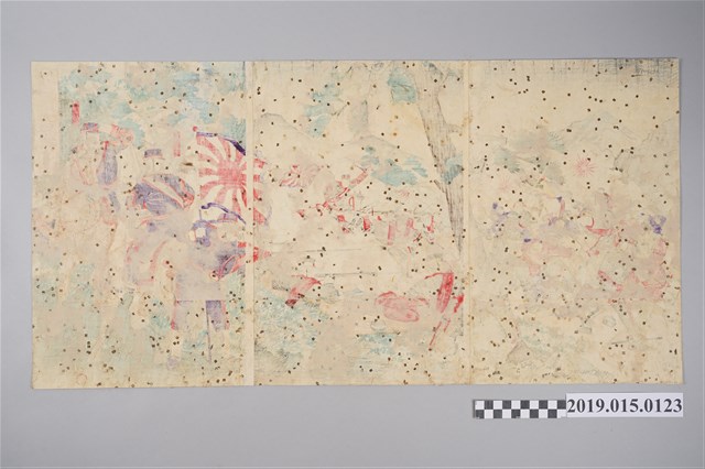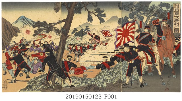 楊齋延一所繪畫作,上村宏助於明治27年(1894)9月發行,畫面呈現日軍將領野津道貫中將、立見尚文少將帶領日軍擊敗臺灣軍民之意象圖,共1張影幅。楊齋延一(1872-1944),別稱楊齋,明治時期的浮世繪師之一。其作品活躍於1887年至1907年,並多以描繪日清戰爭、日俄戰爭等戰役為主題的浮世繪。 此圖繪左下方落款,「明治廿七年九月印刷發行」。明治27年為1894年,但其實1895年5月29日,接收臺灣的日軍部隊才從現今新北市貢寮區的澳底登陸,為乙未戰爭的開始。但此落款日期卻比實際日期早了8個多月,由此可見此幅浮世繪圖,在當時理應為宣傳海報,宣揚日本軍在臺灣以武力接收臺灣旗開大勝。野津道貫、力見尚文兩位陸軍將領指揮官,為當時日本戰功顯赫常勝軍,藉由宣傳文宣海報,鼓勵軍官士兵作戰士氣,對國內進行宣傳效果。 此系列浮世繪畫報製作年代在1893-1895年之間,詮釋當時日本如何記錄19世紀末的這場大戰,及對戰爭的宣傳情況。當時絕大多數的製作者並未親歷現場,所描繪的圖像內容多為虛構,並不一定符合事實,為對一般民眾的宣傳文宣,達到與中國相互間的政治宣傳與心理戰。浮世繪圖在日本早期絕大多數為木版畫(多彩),少數為石版畫(單彩),是日本江戶時代盛行的民間藝術,既是裝飾物,又傳遞故事和信息。此種繪圖的製作由畫師、雕師、拓師按順序分工合作完成,從繪畫、刻板到上色,有著非常嚴密的工序,和日本人的性格相同,非常細膩與專業。此系列浮世繪畫報極具歷史意義和收藏價值。 此圖屬1895年乙未之役相關印刷類圖像文獻,已典藏入中央研究院臺灣史研究所後設資料及數位影像,圖像史料具特殊性。