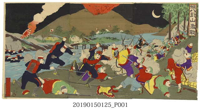 梅堂所繪畫作,村上豐次郎於明治28年(1895)發行,畫面呈現乙未戰爭時日軍攻打八卦山與臺灣民軍激戰之情境,共1張影幅。八卦山之役,為乙未之役期間發生於臺灣彰化縣八卦山的一場抗日戰爭。 此戰役日本軍與臺灣義勇軍征戰多日,雙方的主力分別是日本精銳的近衛師團敬騰及臺灣由吳湯興.吳彭年.徐驤等率領約五千名義勇軍及清兵混合部隊,臺灣義勇軍最後被圍剿在八卦山頂,全軍覆沒,滿山滿谷屍橫遍野,為乙末戰爭最慘烈與可歌可泣之役。此戰役在臺灣與日軍戰事中,算是最具歷史意義的一戰,八卦山的浴血奮戰,雖抵擋不住日軍的南下,但日軍在八卦山亦受嚴重打擊,指揮官山根信成在此役中陣亡,是乙未戰爭中死亡的最高指揮官。亦傳聞北白川宮能久親王 ( 明治天皇之兄長 ) 在此役中也陣亡,但日軍為整體軍心士氣和榮譽考量,其死亡時間、陣亡或病死,日方皆不于公開,史料眾說紛紜。 此圖繪在此一系列戰事浮世繪圖中,算是最公正的報導,連標題都只下「八卦山激戰」一詞。圖面上遠方山頭招受砲擊,戰事從白天進行到夜晚,雙方人馬奮力激戰,不見哪方在圖繪中宣示勝利,最後日軍雖獲勝但也死傷慘重。 此系列浮世繪畫報製作年代在1893-1895年之間,詮釋當時日本如何記錄19世紀末的這場大戰,及對戰爭的宣傳情況。當時絕大多數的製作者並未親歷現場,所描繪的圖像內容多為虛構,並不一定符合事實,為對一般民眾的宣傳文宣,達到與中國相互間的政治宣傳與心理戰。浮世繪圖在日本早期絕大多數為木版畫(多彩),少數為石版畫(單彩),是日本江戶時代盛行的民間藝術,既是裝飾物,又傳遞故事和信息。此種繪圖的製作由畫師、雕師、拓師按順序分工合作完成,從繪畫、刻板到上色,有著非常嚴密的工序,和日本人的性格相同,非常細膩與專業。此系列浮世繪畫報極具歷史意義和收藏價值。 此畫圖為木版畫(多彩),是由三張印刷圖膠黏合成,當時稱為三連錦繪圖。此圖屬1895年乙未之役相關印刷類圖像文獻,已典藏入中央研究院臺灣史研究所後設資料及數位影像,圖像史料具特殊性與珍稀性。