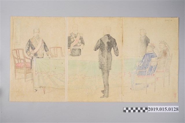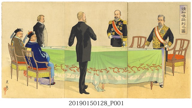 此件為光逸(土屋光逸)所繪畫作,描繪中日兩方進行議和談判之情境,共1張影幅。此幅戰事浮世繪圖,雖未標示繪製發行日期,但日期應落在明治27-28年(1894-1895)。此圖主要是傳遞中日甲午戰爭,日本勝利後戰敗國來求和的會議場景。 此時期的石版畫,在顏色上有做顏色深淺套色處理,例如西裝上的黑色,清朝的官服等。人像臉部生動傳神,椅子的線條細膩,在在呈現出種當時高超的工藝藝術表現。 此系列浮世繪畫報製作年代在1893-1895年之間,詮釋當時日本如何記錄19世紀末的這場大戰,及對戰爭的宣傳情況。當時絕大多數的製作者並未親歷現場,所描繪的圖像內容多為虛構,並不一定符合事實,為對一般民眾的宣傳文宣,達到與中國相互間的政治宣傳與心理戰。浮世繪圖在日本早期絕大多數為木版畫(多彩),少數為石版畫(單彩),是日本江戶時代盛行的民間藝術,既是裝飾物,又傳遞故事和信息。此種繪圖的製作由畫師、雕師、拓師按順序分工合作完成。石版印刷,起源自歐洲,日本以鉛板代替石板,製作過程較木板印刷複雜,為後世鉛版印刷的前身,其工法技巧跟浮世繪相同。但石版畫在線條的處理上較為精緻細膩,尤其在人像的臉部,藉由陰暗面詮釋,有如西洋素描畫表現,為當時繼浮世繪後之新流行風。 此圖屬石版畫印刷品,由三張印刷圖繪膠黏合成,當時稱這為三連錦繪圖。此圖屬1895年乙未之役相關印刷類圖像文獻,圖繪上有「光逸」的親筆簽名,極具珍稀性。此圖影像已典藏入中央研究院臺灣史研究所後設資料及數位影像,圖像史料具特殊性與珍稀性。
