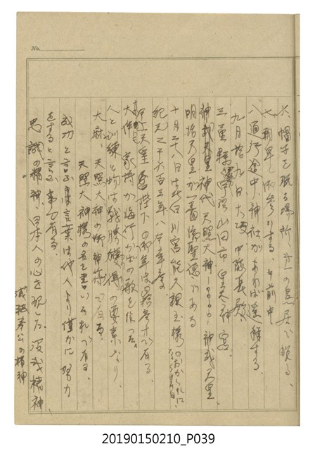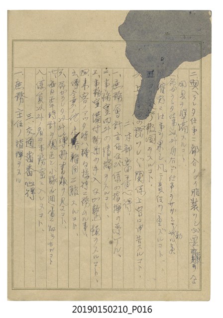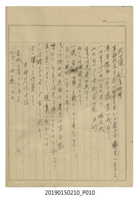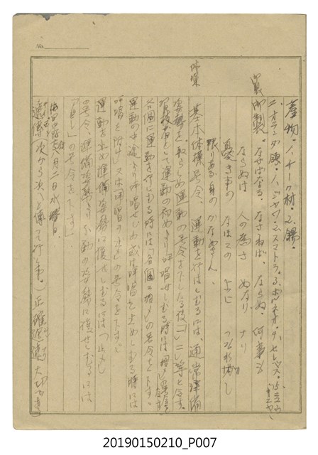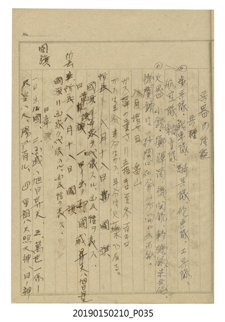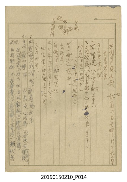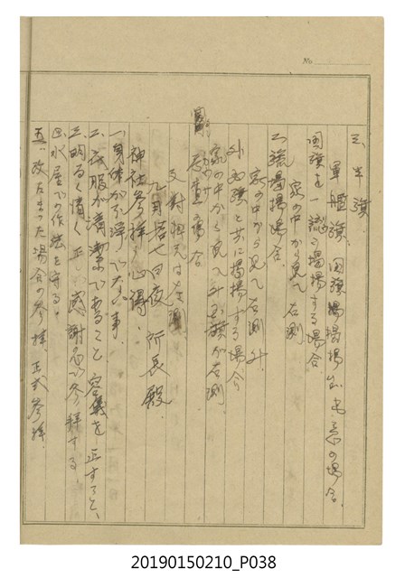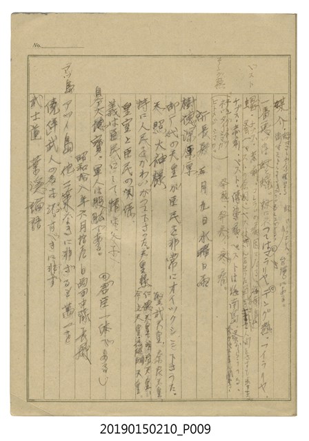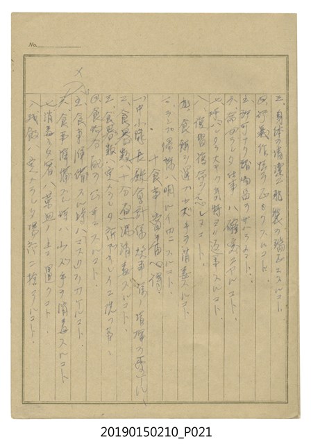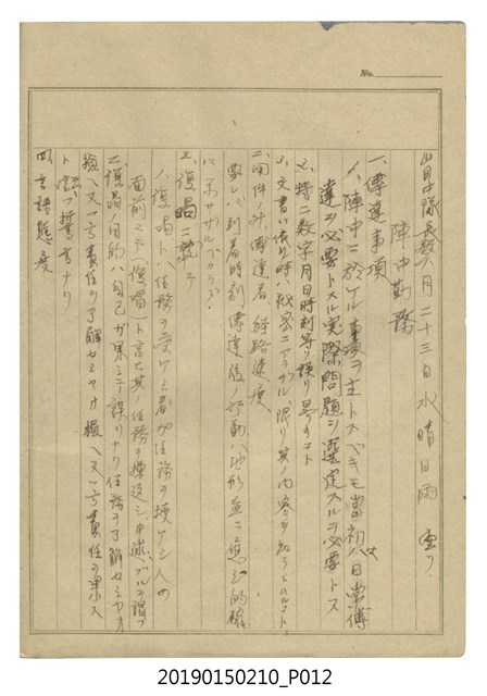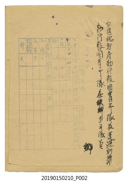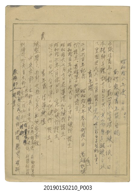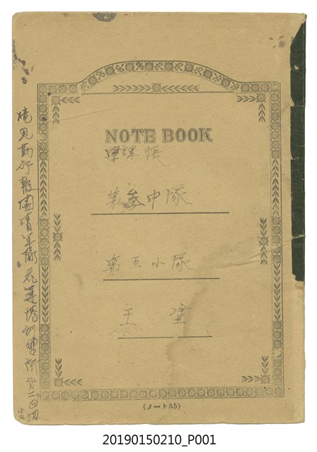 本件屬於日治晚期竹南庄鹽館前王家之部落社會教化政策相關文書其中一件。1940年起,臺灣各地陸續成立「國民道場」的組訓單位,要求青年參加為期1個月的皇民化養成,進行民防編組與軍事教練(含打靶)。又1940年3月創設「勤行報國青年隊」,於臺北、臺中、臺南、高雄、花蓮等地設置訓練所,臺灣青年先在國民道場集訓1個月後,再挑選進入所謂「勤行報國青年隊」,有系統接受的6個月軍事教育,培訓軍夫幹部,進行軍事訓練、學科教育、精神訓話、體力勞動等。本件即「勤行報國青年隊」隊員理學科筆記本,擁有者是王塗,是「勤行報國青年隊」第24梯次,編在第3中隊第5小隊。其後1941年,成立皇民奉公會,並在全臺開辦了66處「軍事訓練場」,對到達役齡的臺灣青年施以短期軍事訓練。更在1941年年底,臺灣總督頒布〈臺灣青少年團設置要綱〉,將「臺灣聯合青年團」與「少年團」合併,改編為「臺灣青少年團」,將青年其「聚集在一元化的組織下,施予統制的訓練」。