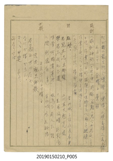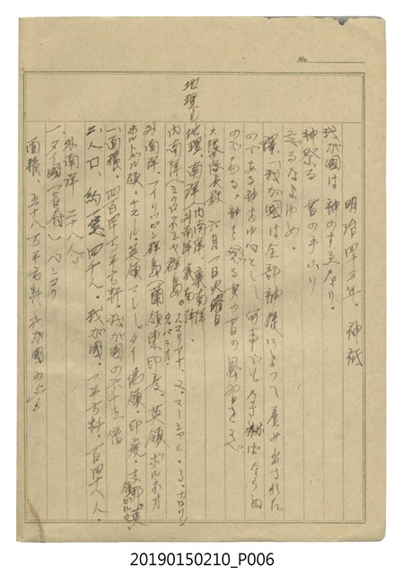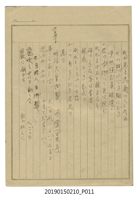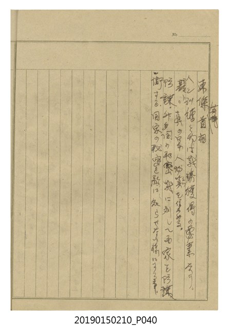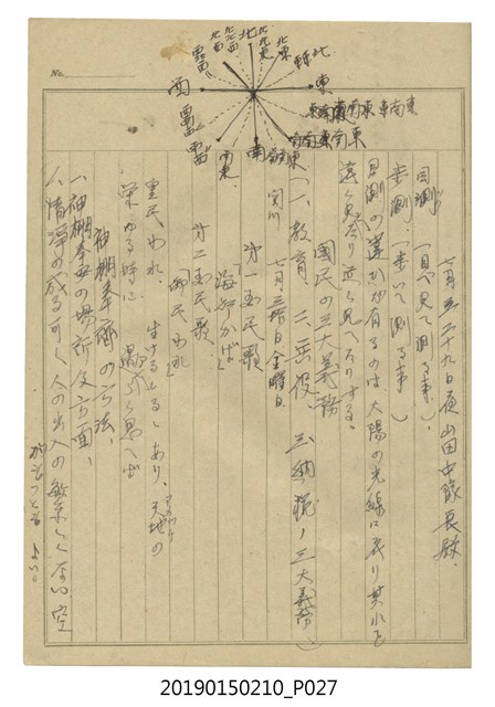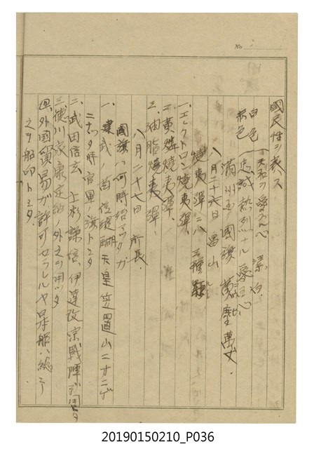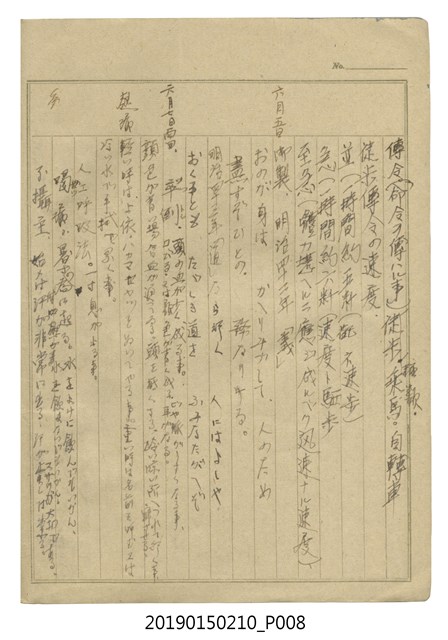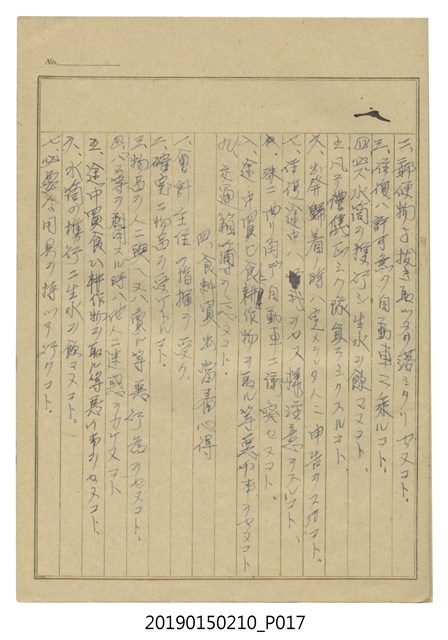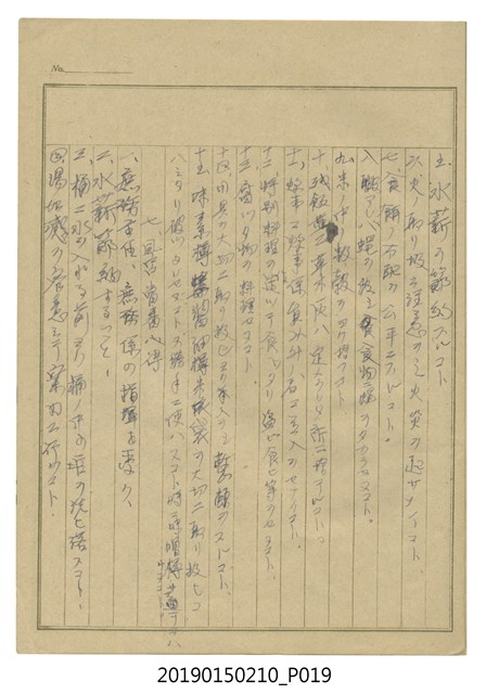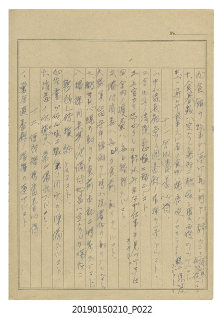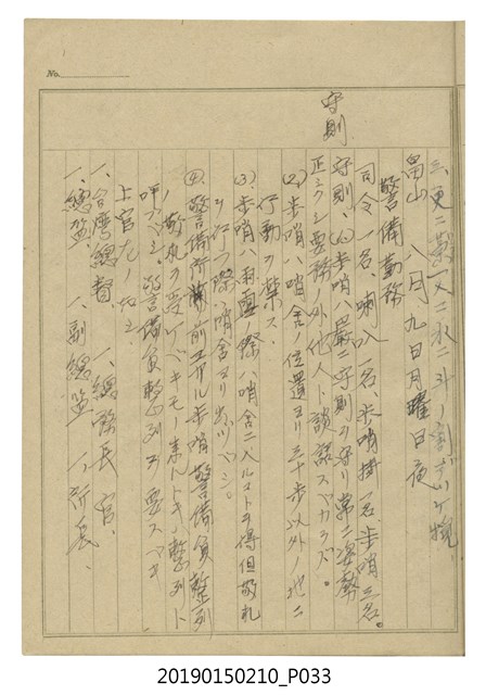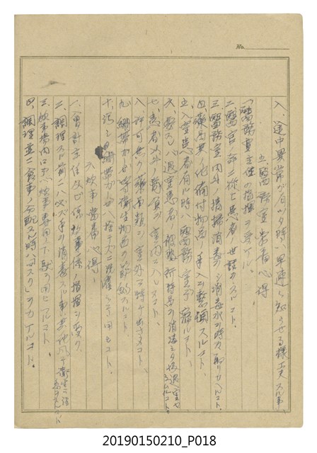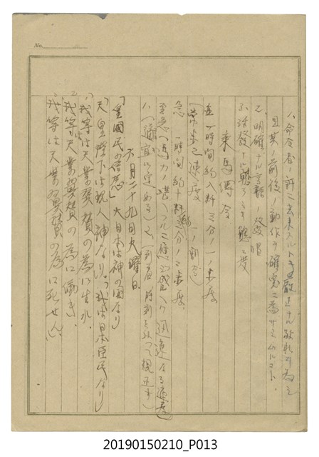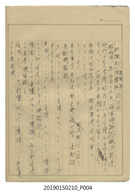 本件屬於日治晚期竹南庄鹽館前王家之部落社會教化政策相關文書其中一件。1940年起,臺灣各地陸續成立「國民道場」的組訓單位,要求青年參加為期1個月的皇民化養成,進行民防編組與軍事教練(含打靶)。又1940年3月創設「勤行報國青年隊」,於臺北、臺中、臺南、高雄、花蓮等地設置訓練所,臺灣青年先在國民道場集訓1個月後,再挑選進入所謂「勤行報國青年隊」,有系統接受的6個月軍事教育,培訓軍夫幹部,進行軍事訓練、學科教育、精神訓話、體力勞動等。本件即「勤行報國青年隊」隊員理學科筆記本,擁有者是王塗,是「勤行報國青年隊」第24梯次,編在第3中隊第5小隊。其後1941年,成立皇民奉公會,並在全臺開辦了66處「軍事訓練場」,對到達役齡的臺灣青年施以短期軍事訓練。更在1941年年底,臺灣總督頒布〈臺灣青少年團設置要綱〉,將「臺灣聯合青年團」與「少年團」合併,改編為「臺灣青少年團」,將青年其「聚集在一元化的組織下,施予統制的訓練」。