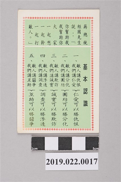 國防部1990-1991年「互助組組員實踐卡」,印有實踐要領與基本認識。國軍互助組制度國軍「互助組」制度,以部隊友有不同編制,大致以3至5人為伍、10人為一小組;編組休假互助組落實回報機制,另輔以在軍隊組織中,成立所謂的生活「互助組」。與編號107074-0016「互助組組員實踐卡」差異在於實踐要領中提及「破案獎金三百萬,知敵不報判徒刑」,且須隨時攜帶此卡,紙面上規定每週一回報由組長帶領朗誦一遍。比對編號107074-0012 國防部1991年印「國軍官兵言行準則」精簡本頁31,「破案獎金三百萬,知敵不報