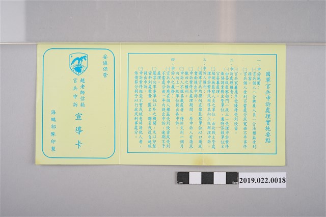 海鵬部隊印「趙老師信箱官兵申訴宣導卡」。國軍於1979年效法「張老師」機構成立「心理輔導中心」,陸軍以「趙老師」為化名,設置趙老師信箱負責部隊官兵心理輔導諮商工作,是由預官採臨時編組方式。紙面上說明單位若無監察人員編制,會由政戰主管處理相關工作,捐贈者口述說明在部隊中若有投訴,會先經過政戰士再到各業務主管單位。