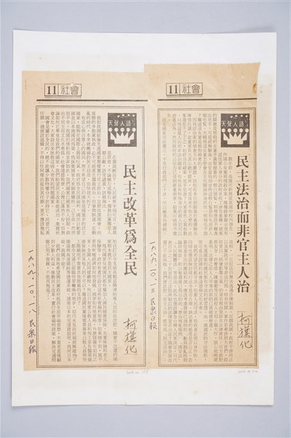 1.柯旗化1989年10月18日文章〈民主改革為全民〉剪報,刊載於《民眾日報》「天聲人語」專欄。 2.柯旗化於1982年完成最後一本英文教科書後,便一心轉向投入宣揚台灣意識的文化事業,包括編寫《台灣文化圖書目錄》與創辦《台灣文化》季刊之外,也積極撰寫詩作、社論投稿到台、日等報章雜誌,多數投稿在《台灣文藝》雜誌雙月刊、《笠》詩刊、《民眾日報》天聲人語專欄等等,此時期的柯旗化企圖跳脫白色恐怖冤獄的陰影,反而更無畏、積極地為自己的政治理念發聲,另外,柯旗化從創作詩開始便有將其作品轉譯成台語、日語、英語的習慣,於文章的寫作也是如此,因此可以發現因為語言版本的關係也有一稿多投得情況。本捐贈案文物囊括柯旗化生前最完整的親筆手稿(複寫稿),十分珍貴,其中又以未刊登或未註明投稿的手稿為最多,共收藏有146件(包含複寫稿)、其次是柯旗化投稿於《台灣文藝》季刊的作品42件,以及《民眾日報》天聲人語專欄刊登的社論32件,其餘數件刊登於《笠》詩刊、《台灣詩季刊》、《文學界》等等。