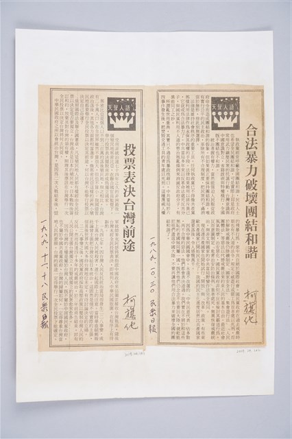 1.柯旗化1989年11月18日文章〈投票表決台灣前途〉剪報,刊載於《民眾日報》「天聲人語」專欄。 2.柯旗化於1982年完成最後一本英文教科書後,便一心轉向投入宣揚台灣意識的文化事業,包括編寫《台灣文化圖書目錄》與創辦《台灣文化》季刊之外,也積極撰寫詩作、社論投稿到台、日等報章雜誌,多數投稿在《台灣文藝》雜誌雙月刊、《笠》詩刊、《民眾日報》天聲人語專欄等等,此時期的柯旗化企圖跳脫白色恐怖冤獄的陰影,反而更無畏、積極地為自己的政治理念發聲,另外,柯旗化從創作詩開始便有將其作品轉譯成台語、日語、英語的習慣,於文章的寫作也是如此,因此可以發現因為語言版本的關係也有一稿多投得情況。本捐贈案文物囊括柯旗化生前最完整的親筆手稿(複寫稿),十分珍貴,其中又以未刊登或未註明投稿的手稿為最多,共收藏有146件(包含複寫稿)、其次是柯旗化投稿於《台灣文藝》季刊的作品42件,以及《民眾日報》天聲人語專欄刊登的社論32件,其餘數件刊登於《笠》詩刊、《台灣詩季刊》、《文學界》等等。