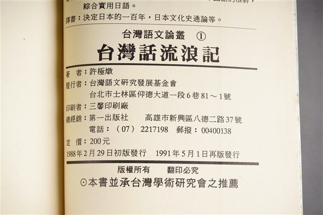 本書為許極燉著《台灣話流浪記》由第一出版社出版,為1991年第二印,初版則為1988年2月,內容收錄台灣語文研究發展基金會十篇論文,前6篇有關台語的論述,7-10篇則是有關北京官話的論述,過去被台語研究者視為必備書籍。著者許極燉,為柯旗化好友之一,1980年以後專心投入台灣福佬語文的研究,因此與當時創辦《台灣文化》季刊的柯旗化結識,柯旗化也協助刊登部份文章於季刊中,過去曾幫助柯蔡阿李校對柯旗化中譯版的《台灣監獄島》以及安息歌台語版的翻譯。許極燉重要的台灣話研究著作有《台灣話流浪記》、《台灣語概論》、《台灣話通論》、《常用漢字台語讀音 》等。