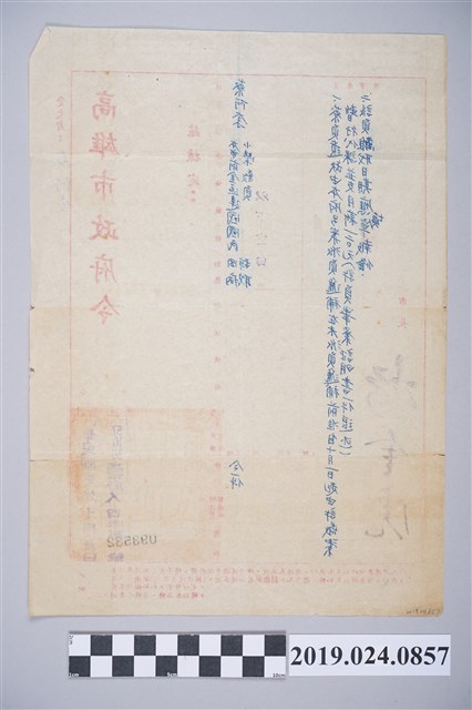 1.蔡阿李,1968年10月30日高雄市政府令,內容為蔡阿李於1968年以生病之理由,向高雄市政府提出辭去建國國民小學教員一職,本文物為高雄市政府收到辭職申請的回覆公文,提到蔡阿李辭職後將由市政府另案派員遞補職缺,由同年10月1日起由許敬潔暫時代課並支月薪120元,並提醒蔡阿李離職日期應填單報備,當時市長為楊金虎,全公文共一張。2.蔡阿李的教職生涯,一直維持優等成績的蔡阿李於1952年畢業不久後,於該年至高雄忠孝國民學校聘請為代課教師,代課一年後,隨即轉往高雄前鎮國民學校繼續代課教師工作並兼任該校的國語補習班講師,期間也參加民眾教育教師講習班、中國地方自治函授學校的課程培養教職的經驗,直至1955年5月20日正式升格為前鎮國民學校的教職員,同年與柯旗化完成結婚。後來在前鎮國小教不到2年時間,於1957年高雄市政府派令轉調蔡阿李前往前金國民學校服務,一直至1965年9月市政府則又再度轉調蔡阿李至建國國民學校教書,直到1968年因病離職。